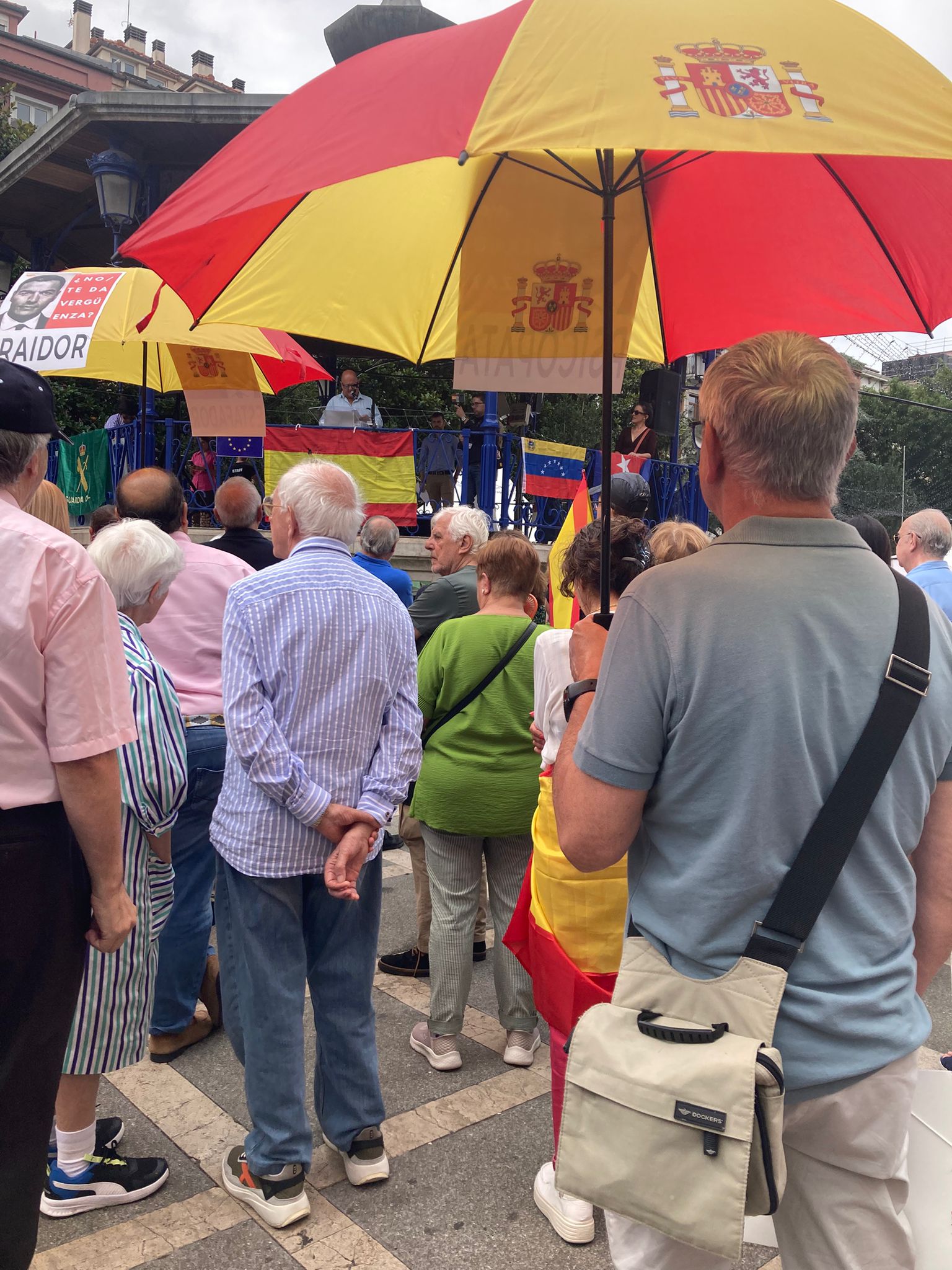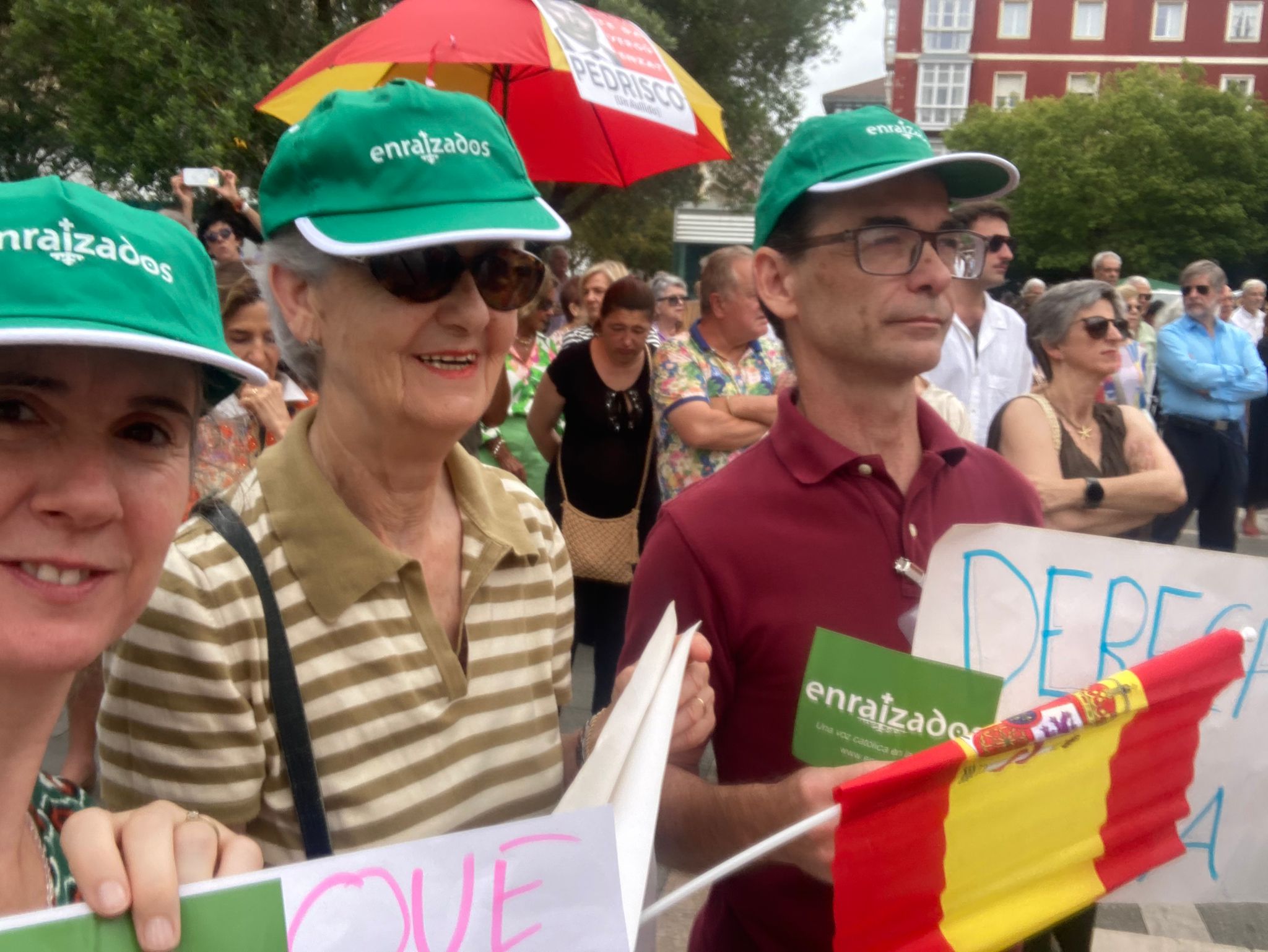 Durante el acto, escuchamos con fuerza consignas como ¡Sánchez dimisión! y ¡España no se vende! Los asistentes portaron pequeñas pancartas y paraguas con los colores de la bandera española en un ambiente marcado por el civismo, la indignación y el compromiso constitucional. También vimos a ciudadanos luciendo las viseras de Enraizados.