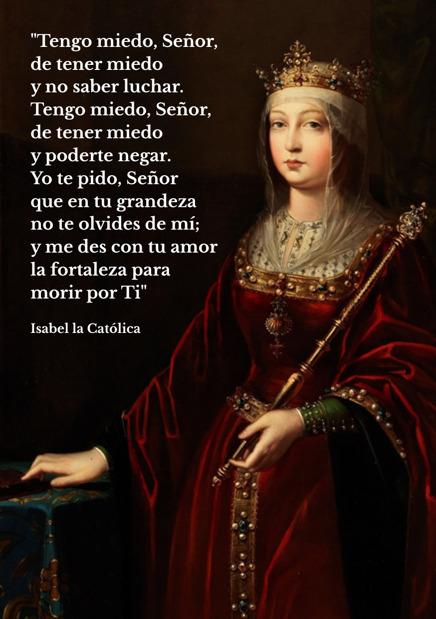 Admiración y devoción siento hacia nuestra más grande reina de toda la historia, ISABEL LA CATÓLICA, QUE TIEMPO AL TIEMPO, SERÁ RECONOCIDA OFICIALMENTE SANTA, COMO A BUEN SEGURO LO ES YA A LOS OJOS DE DIOS. Gracias a ella, Hispanoamérica fue Evangelizada y fue artífice de la unidad de España.